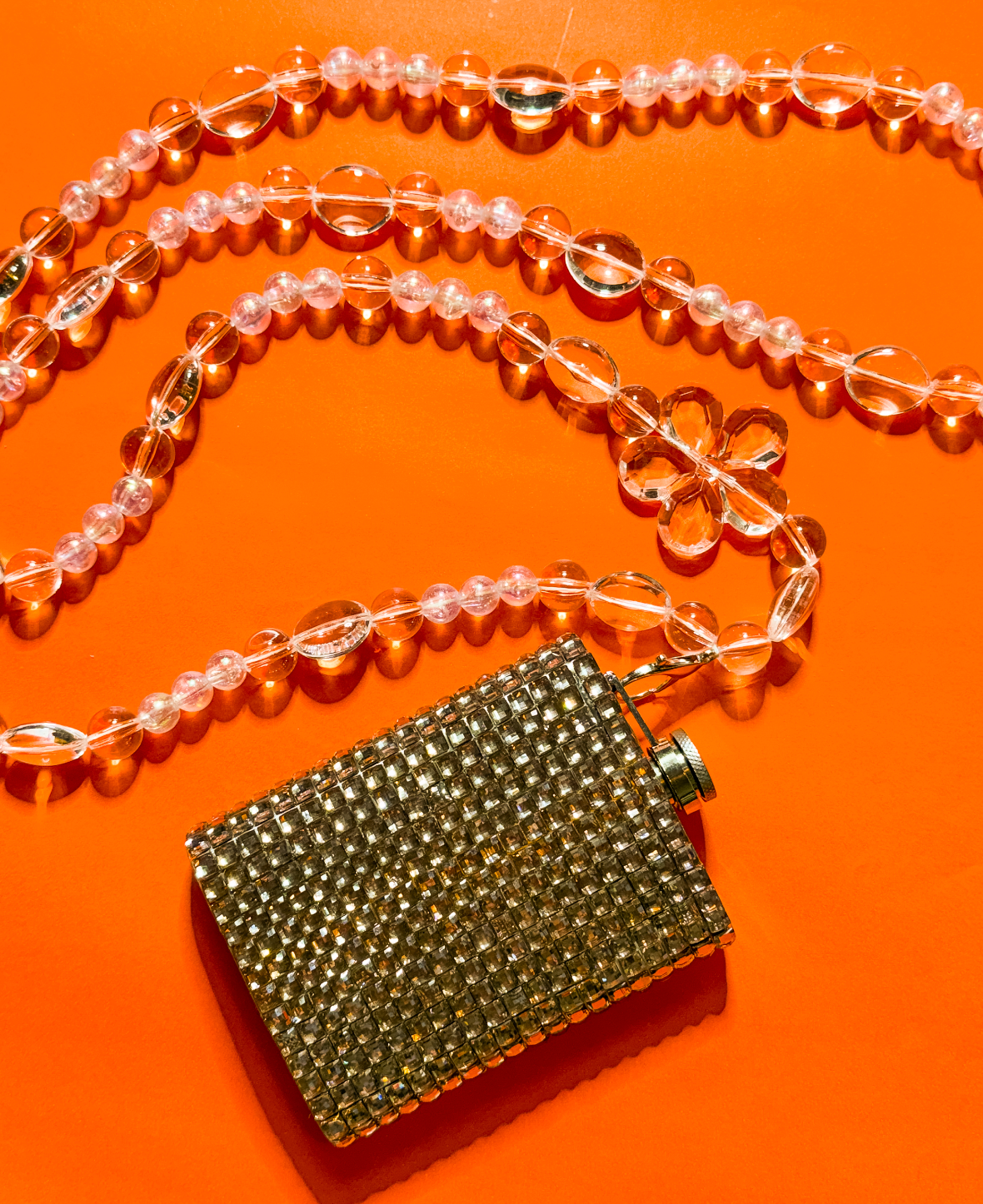 Cantil de aço inox todo feito à mão com alça de miçangas e revestimento inteiro de strass. Escolha o tamanho da alça que você mais fique confortável.