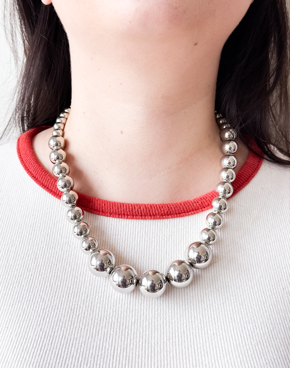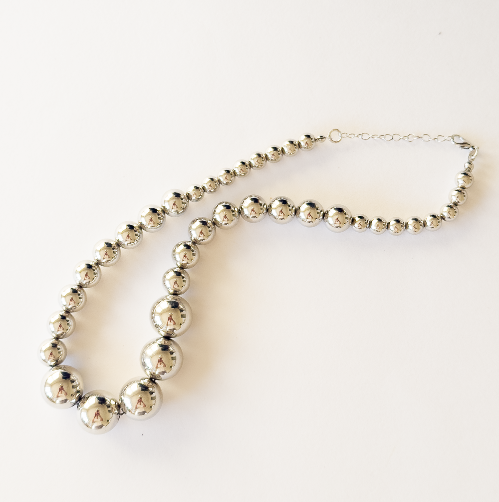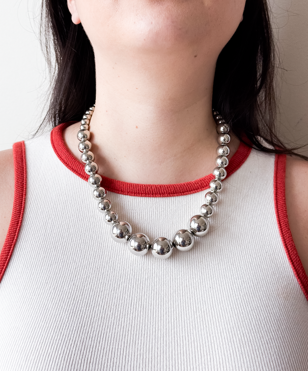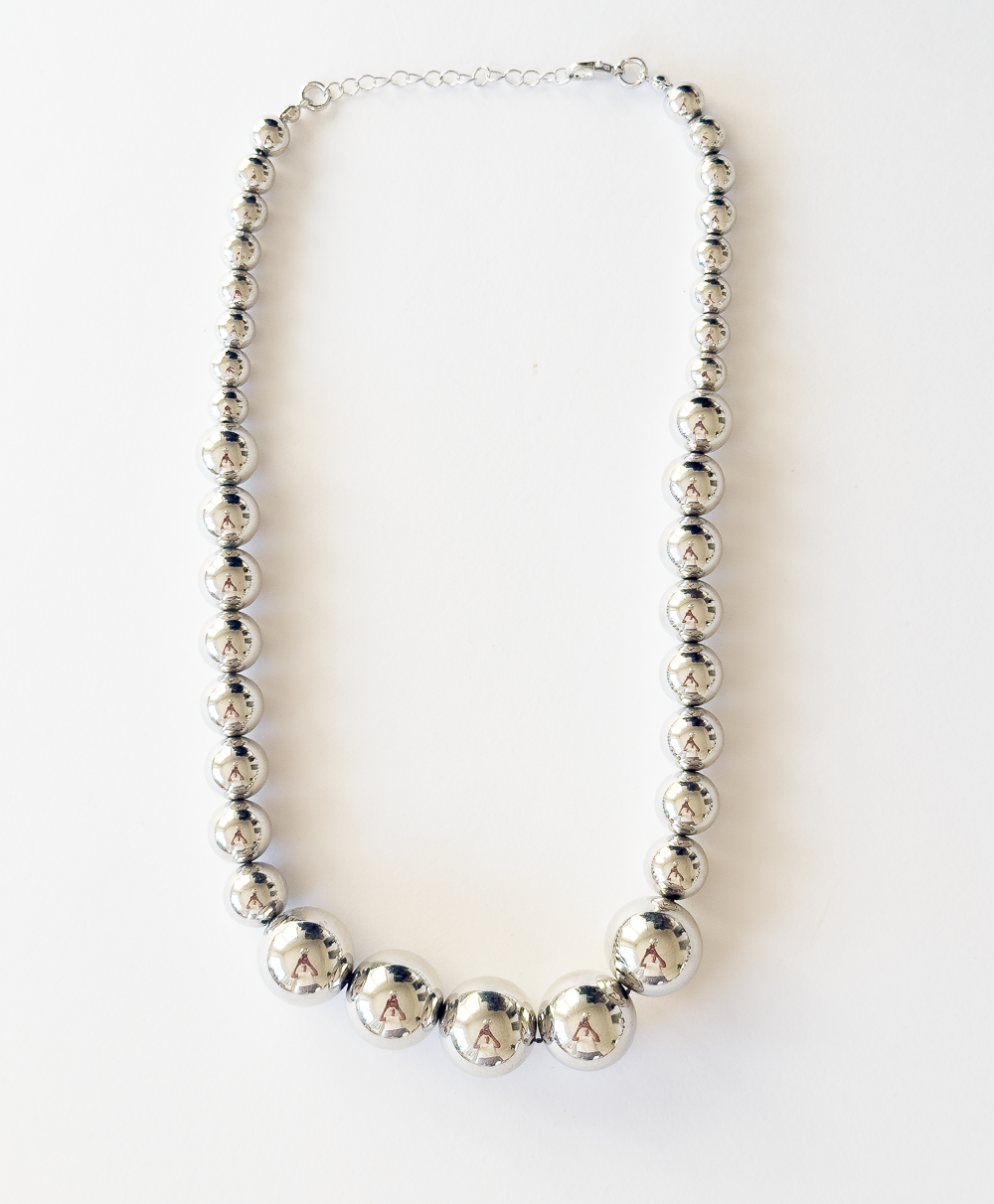 Colar com bolas pratas em diversos tamanhos, ajuste com corrente e fecho lagosta.